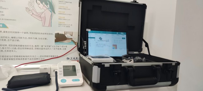 除了SH-T17智能健康一體機,健康中心也配置了SH-202便攜式健康一體機,SH-202便攜式健康體檢一體機是上禾針對基層公衛(wèi)推出的一款便攜式公共衛(wèi)生檢測設備,可以通過平板電腦等數(shù)據(jù)采集終端和數(shù)據(jù)管理軟件系統(tǒng)實現(xiàn)一體化整合,實現(xiàn)心電圖、心率、血糖、血壓、血氧飽和度、尿常規(guī)、體溫等多種參數(shù)檢測,快速建立居民電子健康檔案,與信息管理平臺或健康檔案管理系統(tǒng)進行數(shù)據(jù)交互傳輸,可上傳或成批次/單獨下載調(diào)用數(shù)據(jù),并提供接口開發(fā)包,支持將采集到的健康數(shù)據(jù)上傳至區(qū)域信息平臺或健康檔案管理系統(tǒng)。