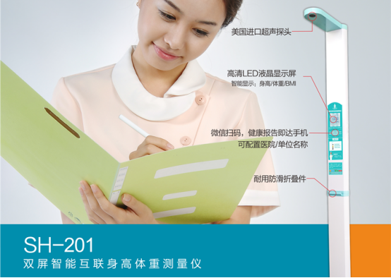 SH-201型雙屏智能身高體重測量儀是傳統(tǒng)數(shù)碼管身高體重測量儀的升級款,彌補(bǔ)了數(shù)碼管體重秤顯示效果單一,語音播報生硬的缺點(diǎn)。傳統(tǒng)的數(shù)碼管語音播報為機(jī)器播報,較為生硬;而SH-201型雙屏超聲波身高體重測量儀則采用智能語音播報,播報語音更人性化;雙屏采用高清的LED液晶顯示屏,可智能顯示身高、體重、BMI指數(shù), 另一個屏幕可配置醫(yī)院或者使用單位名稱,同時測量結(jié)果可以微信掃碼,兼具廣告宣傳和微信吸粉功能,展示效果更好。而在定價上,幾乎等同于數(shù)碼管秤的價格,真正的做到了增值不加價,更多讓利給客戶。
